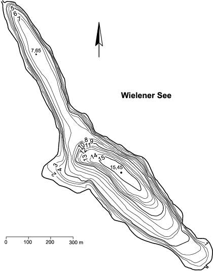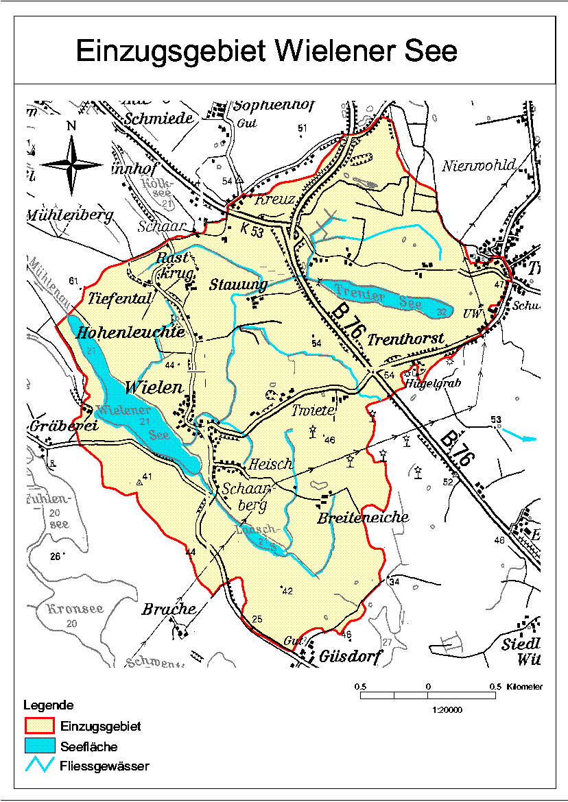 | Einleitung aus Kläranlage: | seit 1996 KA Wielen, EW 250, 2. Reinigungsstufe, ca. 200 m bis zum See |